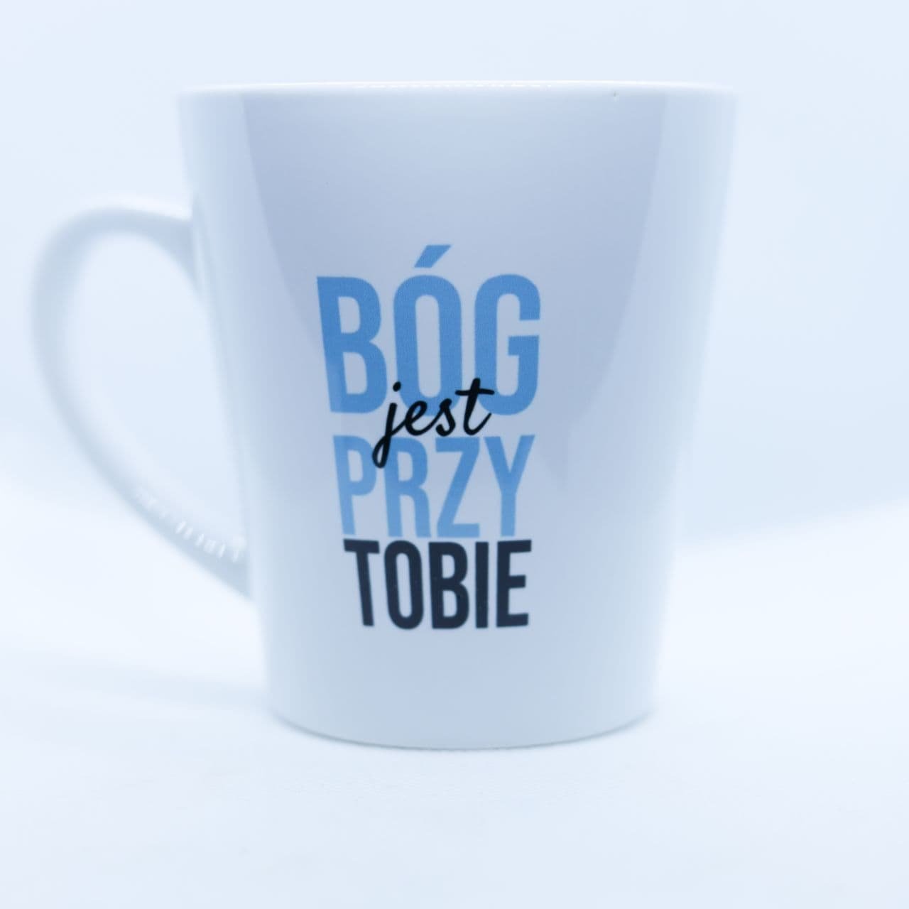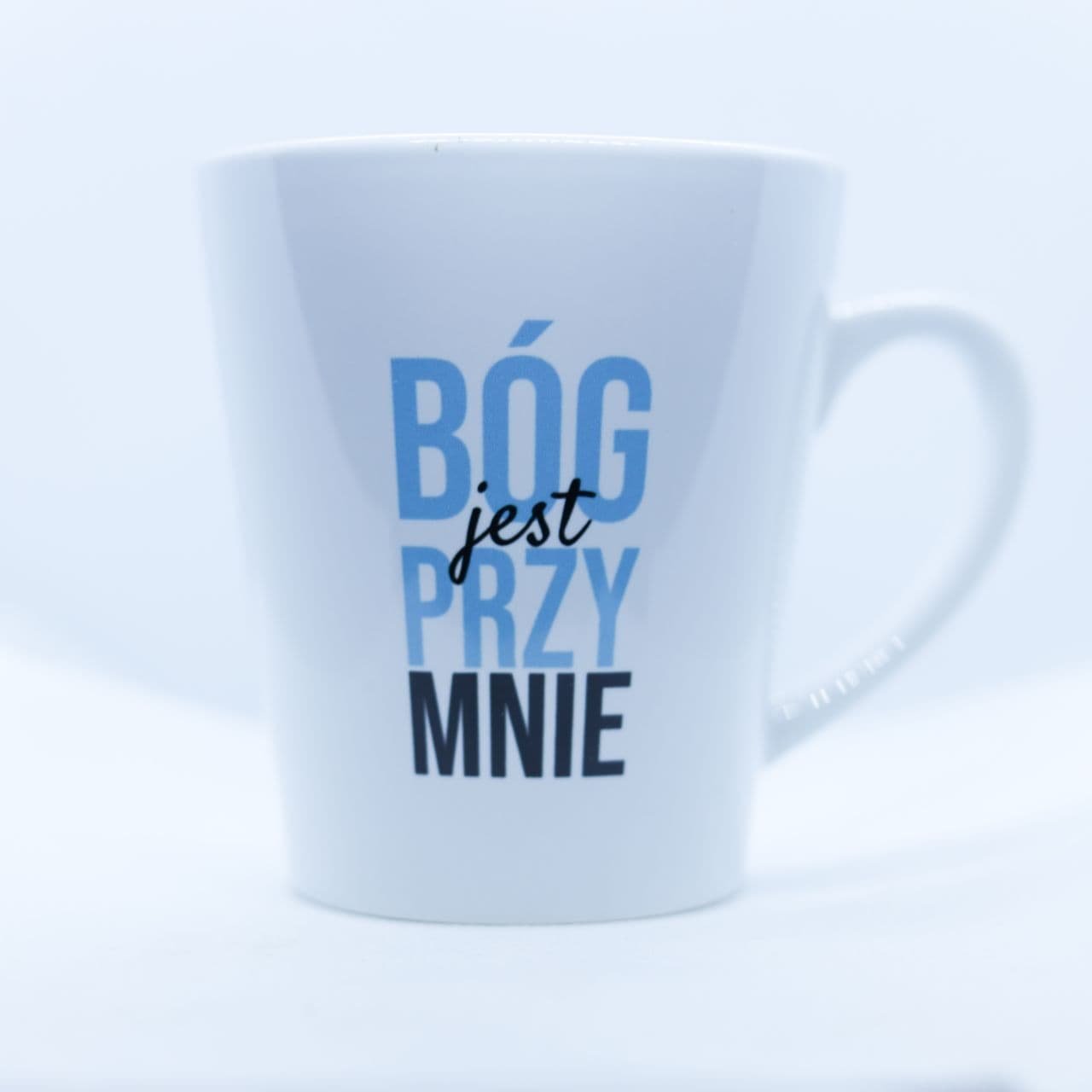 Napis na kubku jest z dwóch stron, po prawej stronie: “Bóg jest przy Mnie”, po lewej stronie “Bóg jest przy Tobie”, więc jeśli jesteś praworęczny i to pijąc z kubka przed sobą masz napis “Bóg jest przy mnie”, a przodem do rozmówcy “Bóg jest przy Tobie”. Jeśli zależy Ci bardzo na wersji dla leworęcznych, napisz do nas.